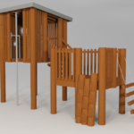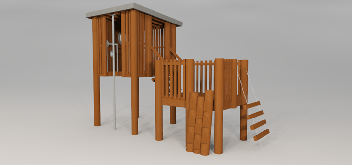 This clever split level raised cubby is striking in appearance and incorporates a variety of play features, while minimising fall zone requirements by having two sides of the upper cubby deck enclosed with full height slat walls and a recessed fireman’s pole on another side of the upper deck. The Edge Tower is constructed predominantly from Jarrah and has a galvanised steel subframe for the upper deck.